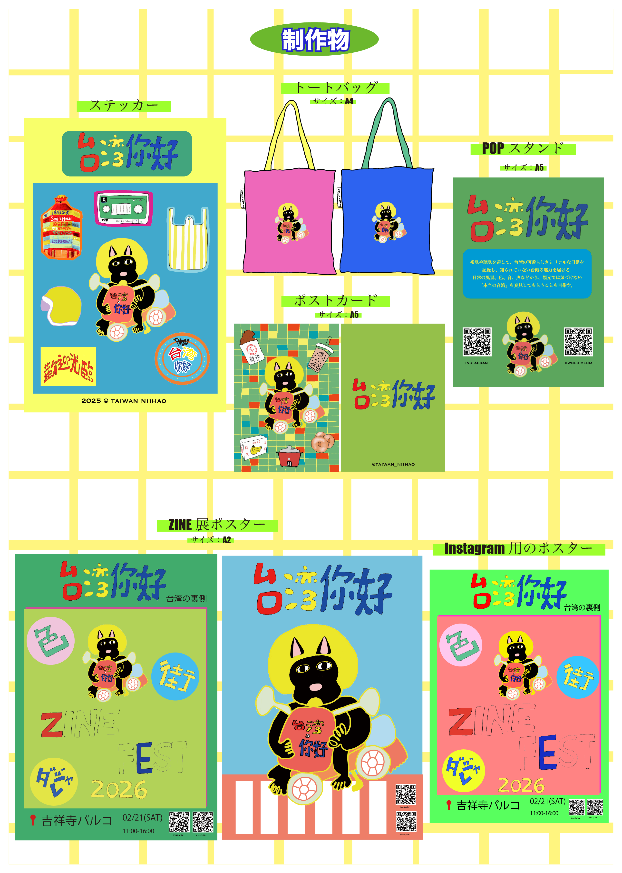 台湾人の視点で撮影した日常風景と温度のある文章をまとめたzineを制作し、台湾の可愛らしさや人との距離感を実物で伝えます。台湾愛好者だけでなく、可愛いものが好きな来場者にも手に取ってもらえる存在を目指します。Instagramでは鮮やかな色使いで統一し、手描きイラストや台湾の日常写真を発信します。