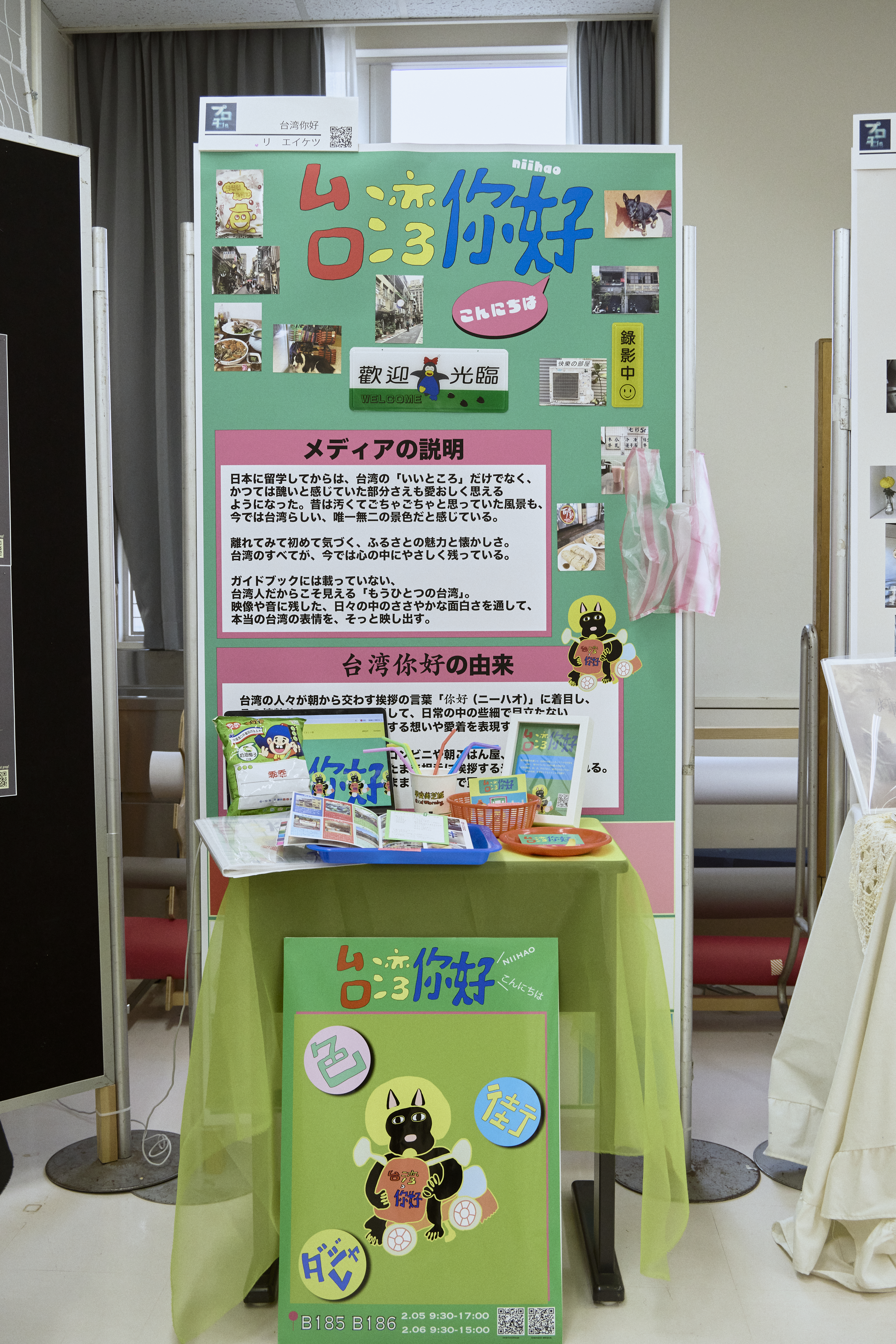 オウンドメディアの世界観と統一し、緑をメインビジュアルカラーとして、台湾の温かみや可愛らしさを来場者に伝えます。机の上には台湾の伝統的なかごやお皿を用いて装飾し、ロゴやステッカー、名刺を配布。壁面には台湾の街の風景写真を展示し、空間全体から生活感が感じられるように工夫しました。