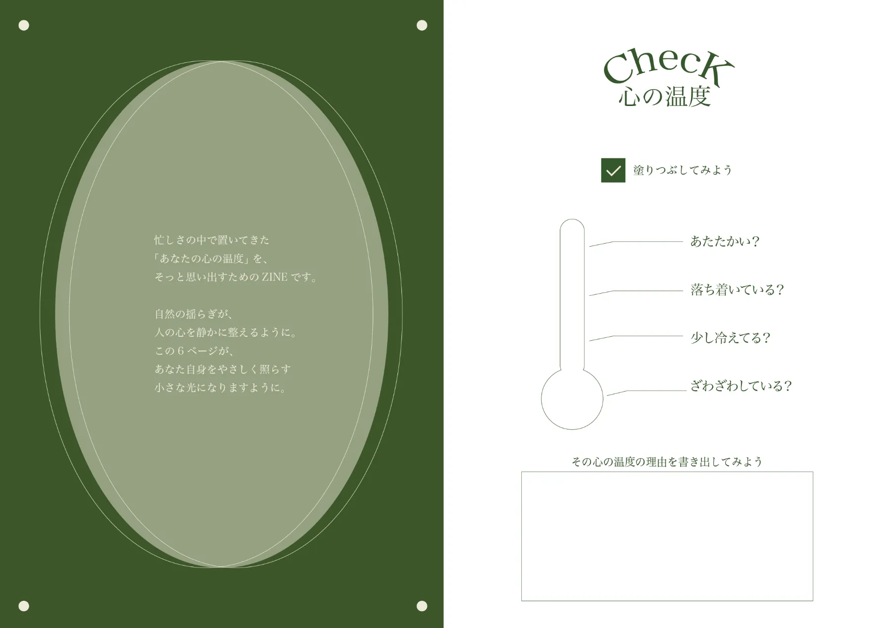 忙しない日常の中で置き去りにしがちな感情や感性に気づくきっかけを届けます。ZINEでは自然や問いを通して自分の心と向き合い、電車広告では移動の隙間時間にふっと立ち止まる体験を作り、ページや広告に触れることで、自分だけの心の休息ポイントを再発見し、深呼吸したあとのような静けさへ導きます。