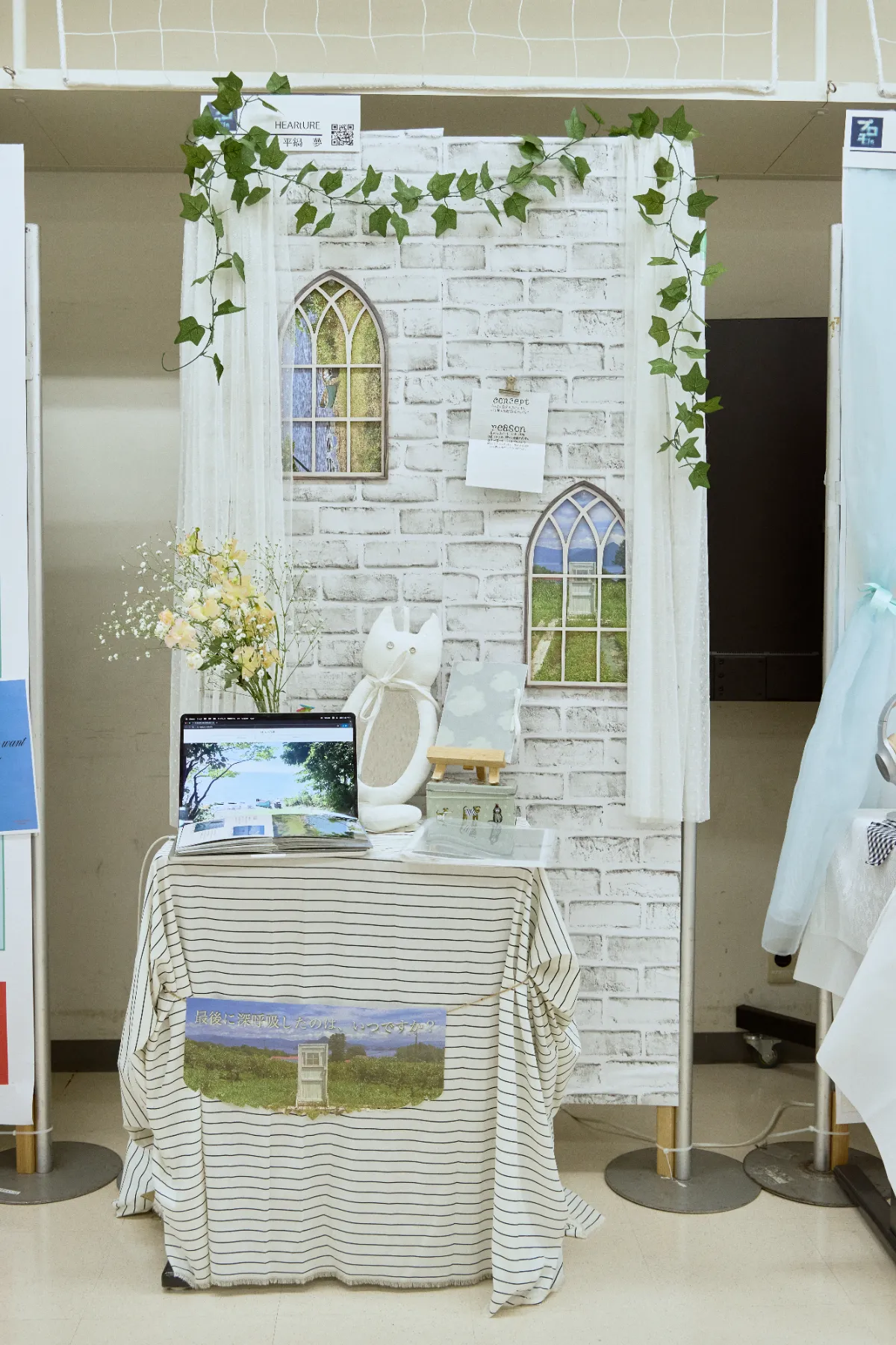 自然を見るための空間ではなく、自然を入口に、自分の心に触れる空間をつくりました。窓のモチーフや、カーテンのような布を使い、外の視線をやわらかく遮ることで、安心して内側に意識を向けられる場を設計しています。