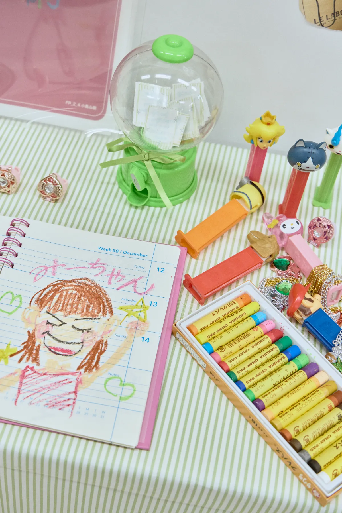 子供部屋をイメージして、世界観が一目で伝わるような展示にしました。大判に写真を直接貼ることで、今までのデジタルな日記がよりリアルに感じ取れるアナログなものに変わります。クレヨンを設置して、きた人に落書きをしてもらえるような構成にしました。